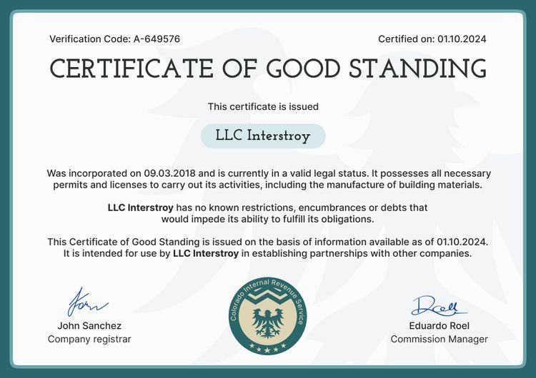 A Certificate of Good Standing is a formal document that signifies that a company, organization, or entity is officially recognized as being in compliance with the regulatory requirements set forth by the state or jurisdiction in which it is registered. This certificate serves as proof that the entity is authorized to conduct its business operations and adheres to all necessary legal standards, such as filing annual reports, paying taxes, and maintaining a valid license.